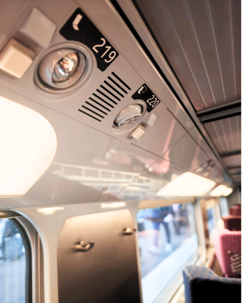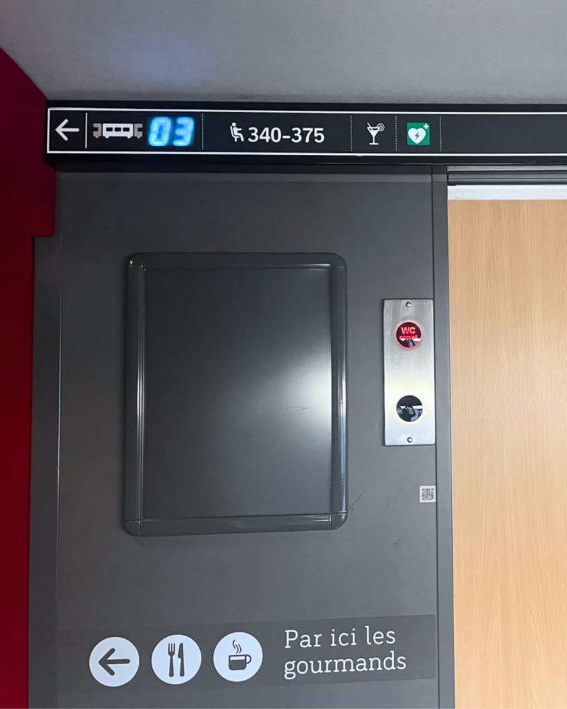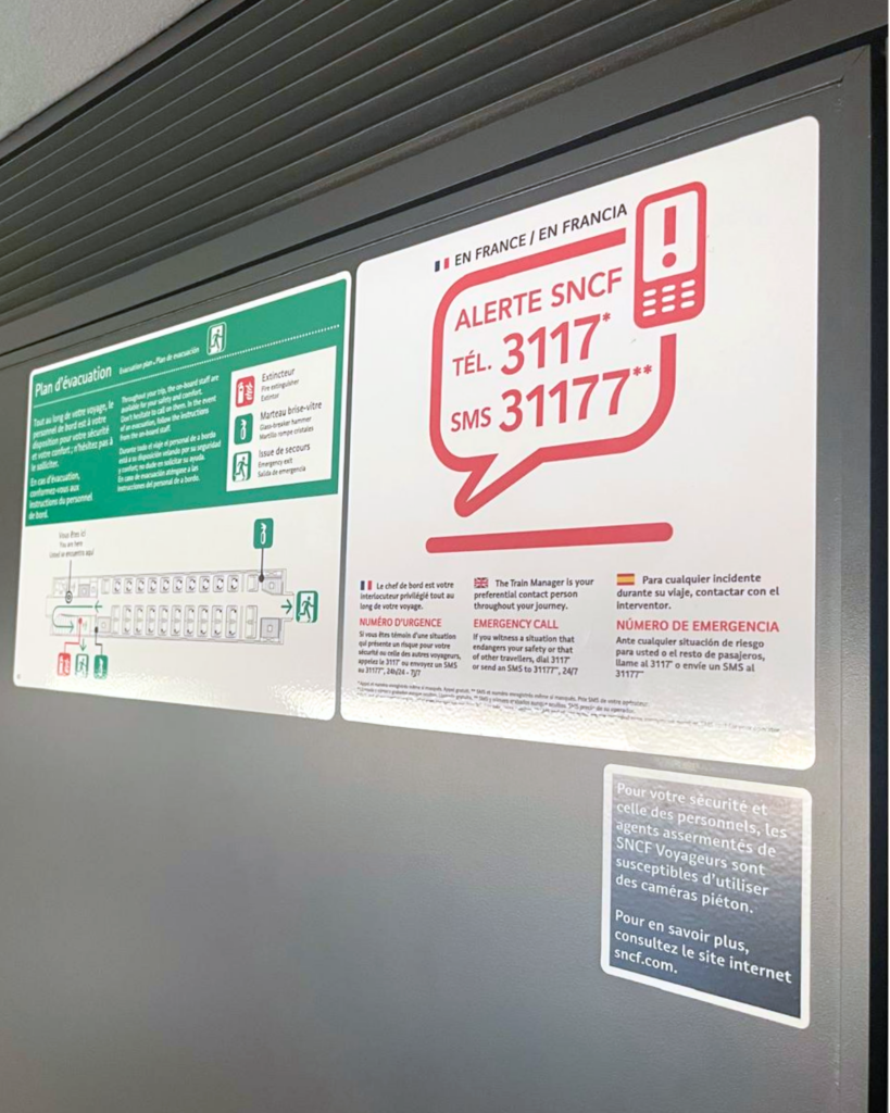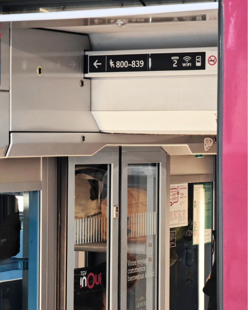 À bord, la signalétique intérieure facilite l’orientation grâce à la numérotation des wagons et des sièges. Trouver sa place devient simple et rapide, améliorant l’expérience globale du voyageur.