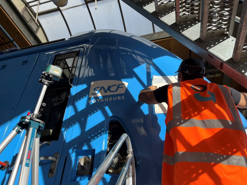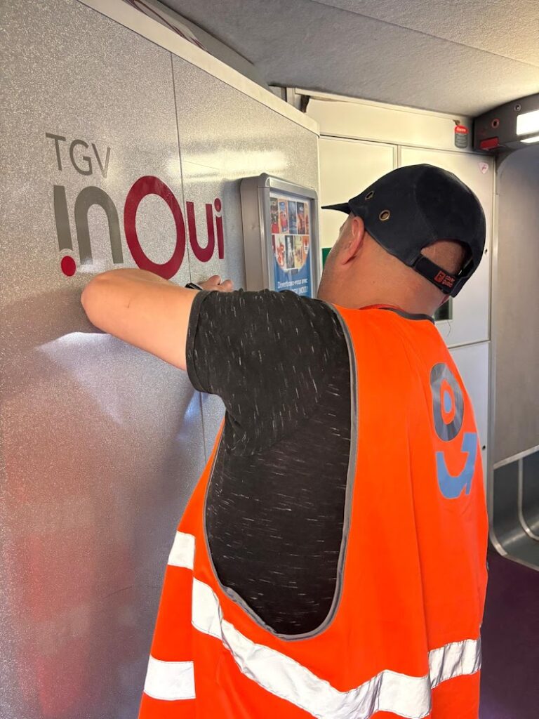 Pour identifier votre train rapidement, nous utilisons un pelliculage stylé qui rend chaque rame facilement repérable à plus de 100 mètres. Cette signalétique extérieure assure la visibilité et la reconnaissance du train dès le premier regard.