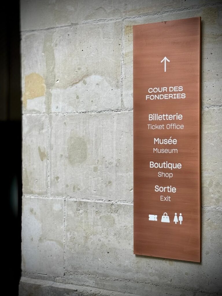 Pour ce projet, près de 40 éléments de signalétique ont été conçus, fabriqués et installés. Le choix du bronze s’est imposé naturellement pour respecter le caractère patrimonial du site tout en garantissant durabilité et élégance.