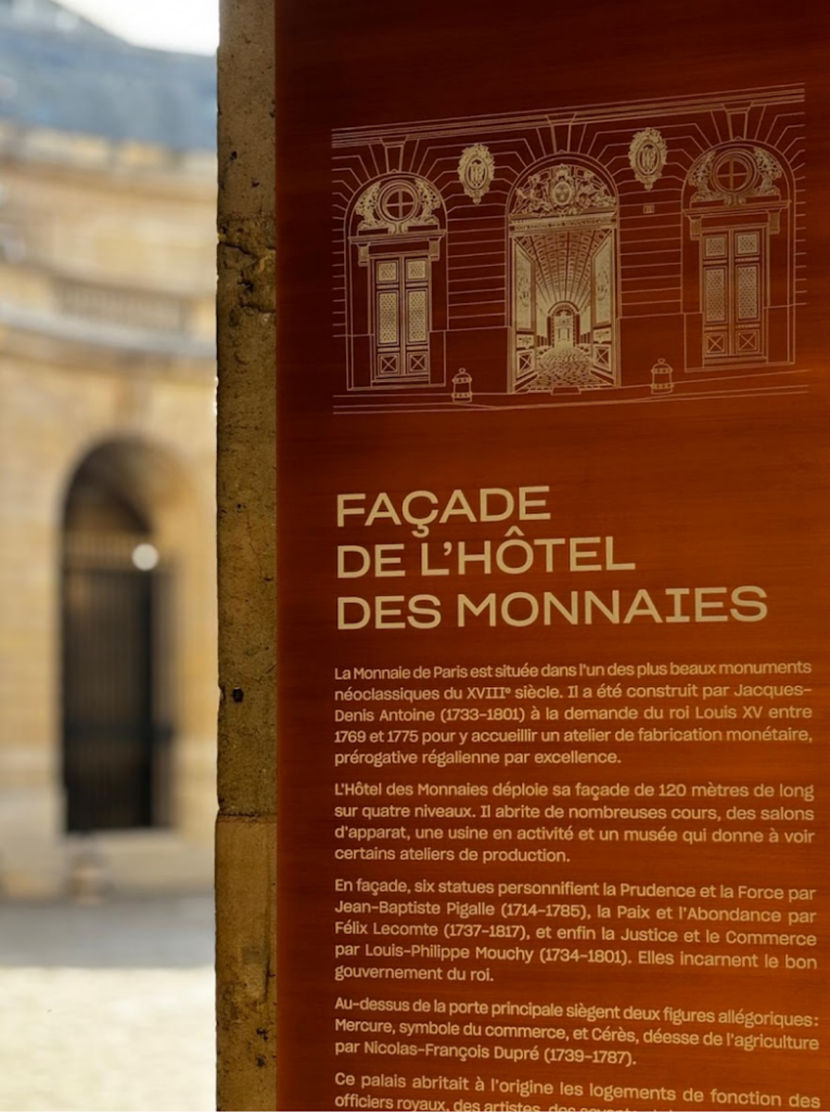 Après avoir réalisé la signalétique extérieure, OXYSIGN a poursuivi son intervention au cœur de la Monnaie de Paris, bâtiment historique imaginé par l’architecte Jacques-Denis Antoine en 1769. Ce projet de signalétique patrimoniale s’inscrit dans une démarche de respect architectural et de mise en valeur des espaces intérieurs, notamment les cours et passages accueillant le public.